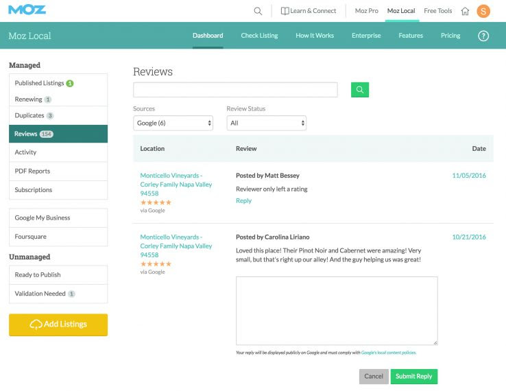 Now you can respond to Google reviews directly from your Moz Local dashboard. And for other review sites, our workflow provides direct links to the specific reviews on those platforms for fast action.